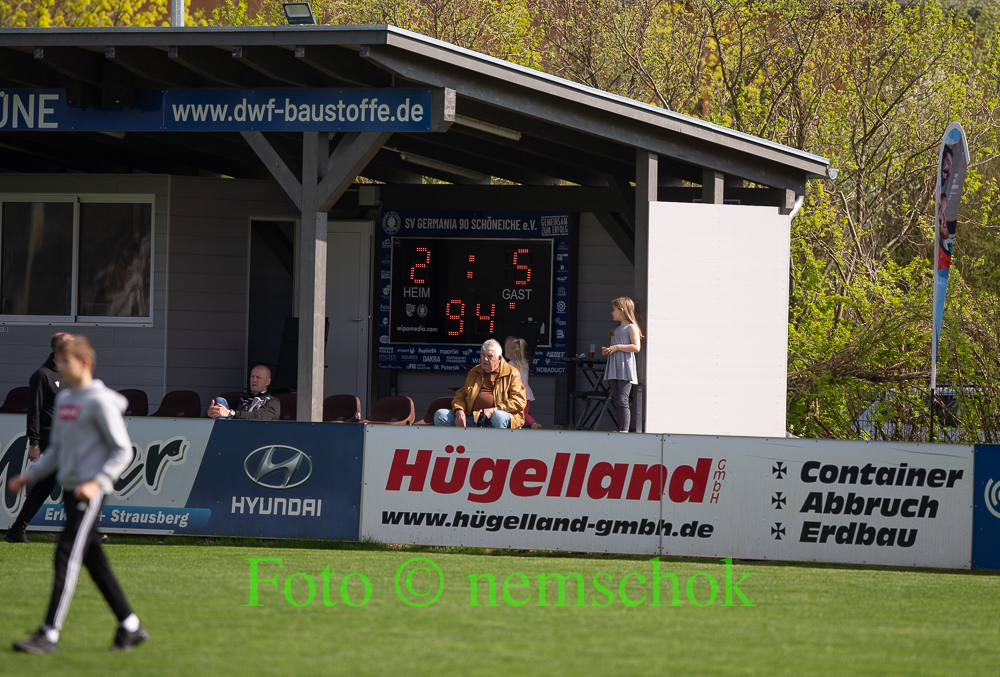 Der Rahmen für das Spitzenspiel konnte besser nicht sein, und der SV Germania Schöneiche erwies sich als großartiger Gastgeber. Das begann an der Kasse mit dem freundlichen Damenteam, das wirklich jeden Gast herzlich begrüßte, ging weiter mit dem emsig flitzenden „Super-Trainer Henry“, der die Zuschauer-Versorgungspunkte auf dem Sportplatzgelände mit seinem Handwagen belieferte und reichte bis hin zum Stadionsprecher Gregor Radam, der kurzfristig für René Hofrichter einspringen durfte. Dank dieser guten Rahmenbedingungen zeigte sich auch Germania-Vorstandsvorsitzender Jens Wiedenhöft gut gelaunt und bedankte sich bei allen Helfern. Auf die Frage, ob man bei seinem SV schon für die Brandenburgliga plane, antwortete er noch vorsichtig: „Die Saison ist noch längst nicht vorbei. Ich sage mal so, wir planen zweigleisig.“