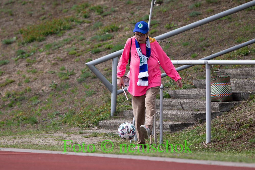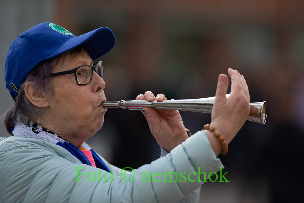 „Wir haben den Sieg verdient - ganz klar“, freute sich auch Germania-Schöneiche-Edelfan Moni. Monika Domschula verpasst kaum ein Spiel und das im besten Fußball-Fanalter von 80 Jahren. „Ich wohne zwar in Rahnsdorf, bin aber seit 2007 echter Germania-Anhänger“, sagte sie mit blau-weißem Schal und einer Fanfare um den Hals. „Alle Spiele kann ich leider nicht sehen, aber die die in der Nähe angepfiffen werden, da bin ich dabei.“ Nach Erkner kam sie im mit ihrem Mann Gerd. „Der sitzt aber auf der anderen Seite des Stadions. Er kann meine Tröte nicht ertragen“, sagt sie mit einem Lächeln auf dem Gesicht.