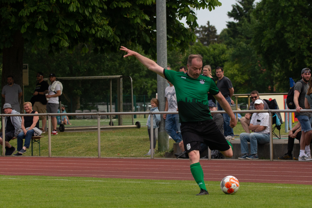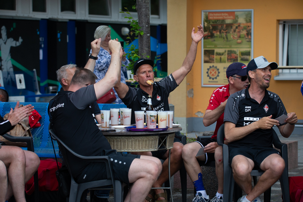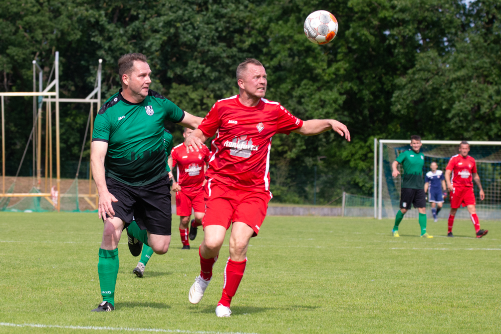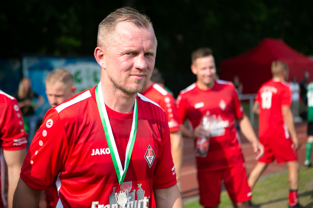 Den Auftakt am Pokaltag machten die ältesten Fußballer. Es war ein Finale mit komplett Frankfurter Beteiligung und es war gleichzeitig das Spiel mit dem klarsten Ausgang. Mit 9:1 siegten die Rot-Gelben des 1. FC Frankfurt. „Wir kennen uns alle und sind auch irgendwie befreundet, so dass das Ergebnis am Ende nicht so ausschlaggebend ist. Wir hatten heute Spaß und konnten den Auftakt für ein schönes Sportfest machen“, freute sich der Älteste auf dem Platz, der 66-jährige Harald Schliebe. Auch wenn er schon knapp 50 Jahre in Frankfurt lebt, sagt er von sich scherzhaft, dass er ein Zugezogener in Frankfurt ist. Er kommt eigentlich aus Breslack (in der Nähe von Neuzelle). Nur einer war ein wenig traurig, da er selbst nicht spielen konnte: Olaf Bitzka muss nach einer Operation noch pausieren.