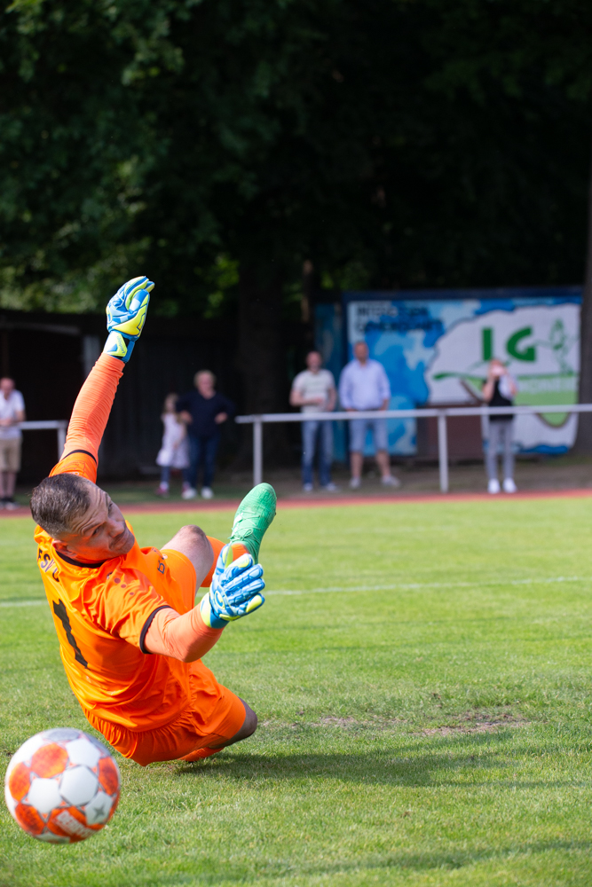 Auch in diesem Spiel Partie reichte die reguläre Spielzeit, bei den Altherren werden zweimal 40 Minuten gespielt, nicht aus, um einen Sieger zu ermitteln. Ohne Verlängerung ging es somit direkt ins Elfmeterschießen. Frankfurts Kapitän Fred Garling und Unions Martin Anders trafen jeweils: 1:1. Frankfurts Sascha Geisler wollte es zu schön machen und mit einem Heber Union-Torhüter Sebastian Drömert überwinden. Der Ball klatschte an die Latte. Daniel Dressler (Union) und Anton Datsuk (Frankfurt) verwandelten jeweils. Frankfurts Torhüter Patrick Behrend konnte den Elfer von Patrick Müller halten. Pech hatte Frankfurts Jens Tischer, der nur den linken Pfosten traf. Schließlich konnte Sebastian Drömert gegen Frankfurts Ronny Dzewior halte. Was dann kam, war ausgelassener Jubel der Männer von der Spree.