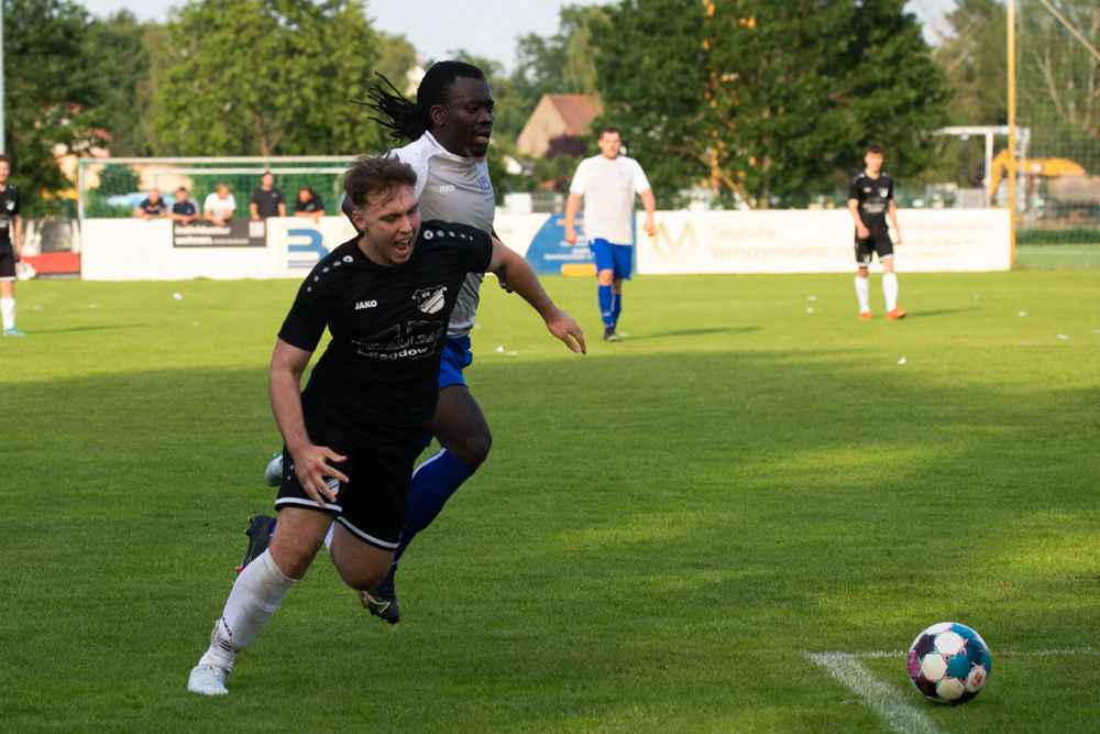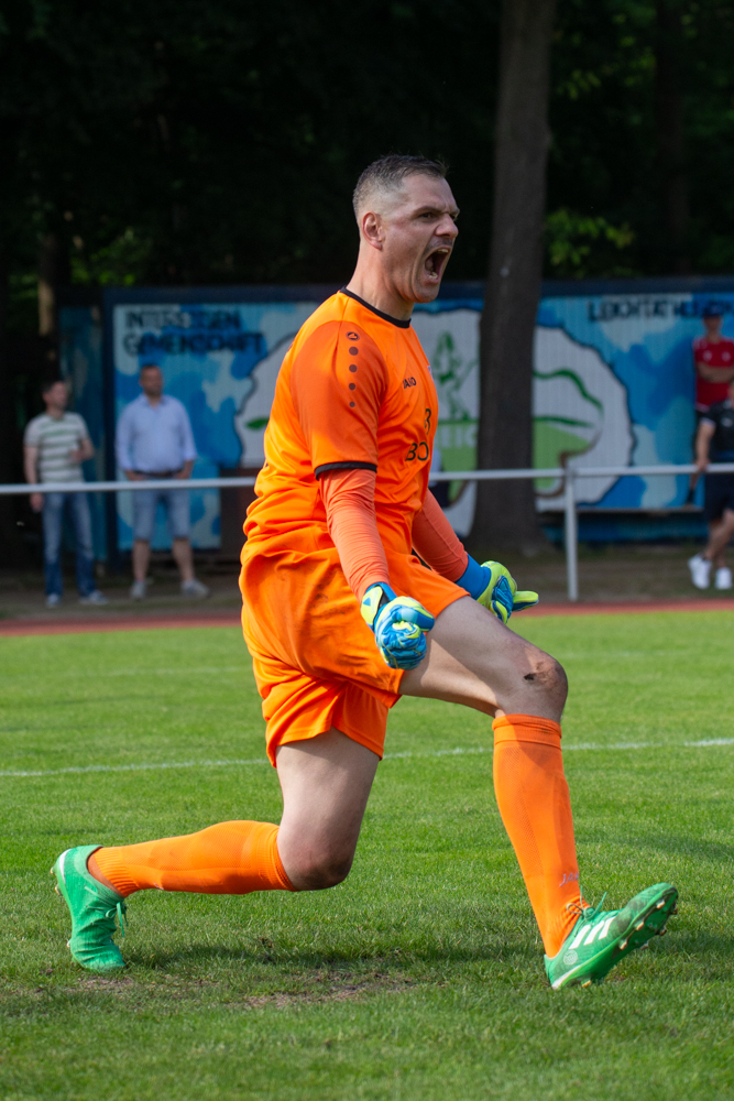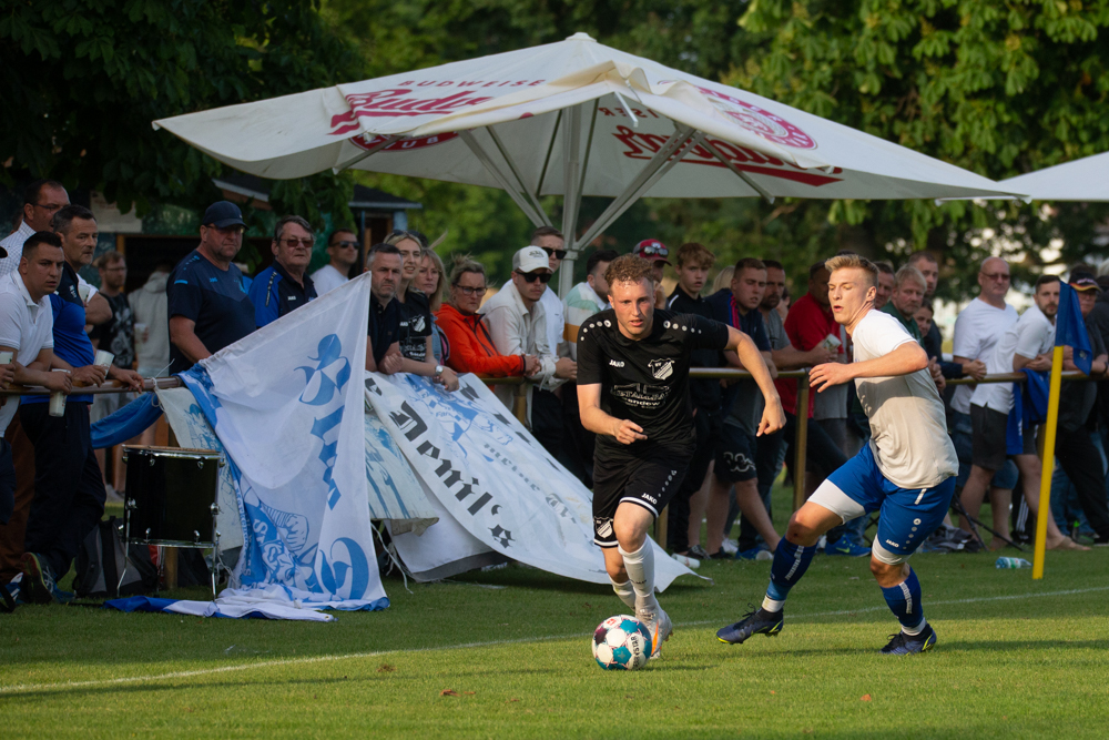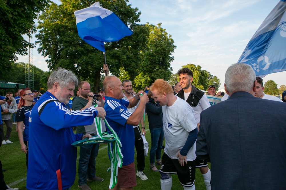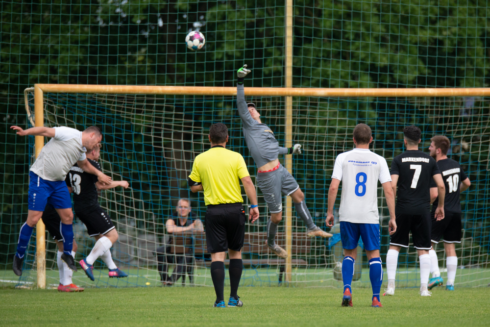 Vor dem Spielbeginn lief Markendorfs Routinier Jan Mutschler mit einem großen Karton unter dem Arm in Richtung seiner Bank. Er gab später zu, dass er dort schon die Sieger-T-Shirts platziert hatte. „Die habe ich zusammen mit meiner Frau schon im Vorfeld gestaltet und gefertigt. Hätten wir nicht gewonnen, hätte ich auch niemandem etwas gesagt. Keiner wusste davon – Ende gut alles gut!“, sagte er im Jubeltaumel nach dem Spiel. Die Männer des SV Blau-Weiß Markendorf feierten einen glücklichen Sieg und gewannen mit 1:0 durch ein Tor, das in der 120. Minute fiel. Torschütze war Oscar Firmin Neguini.