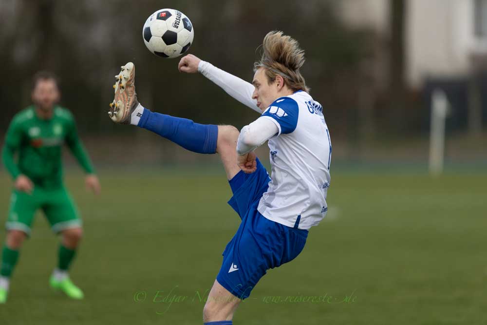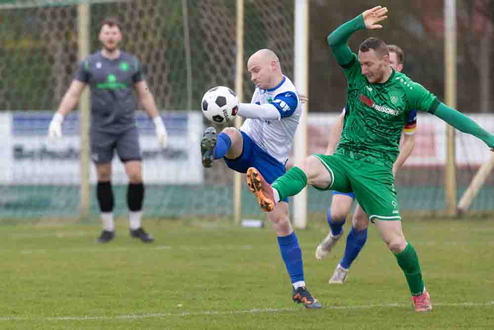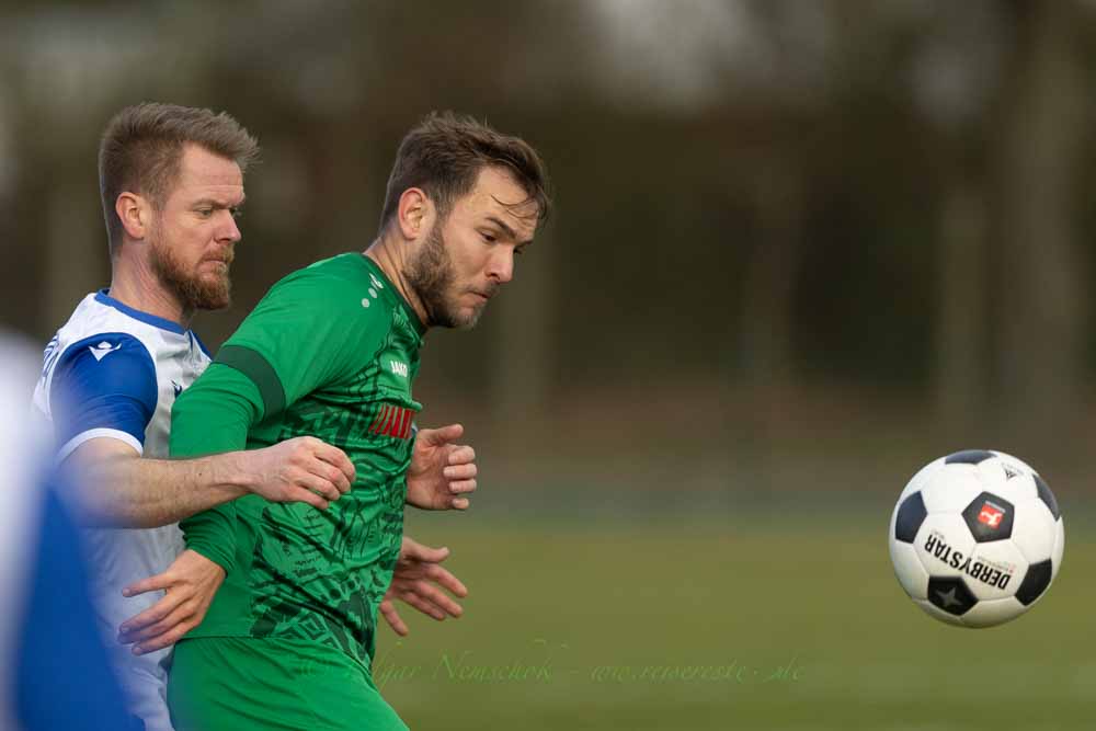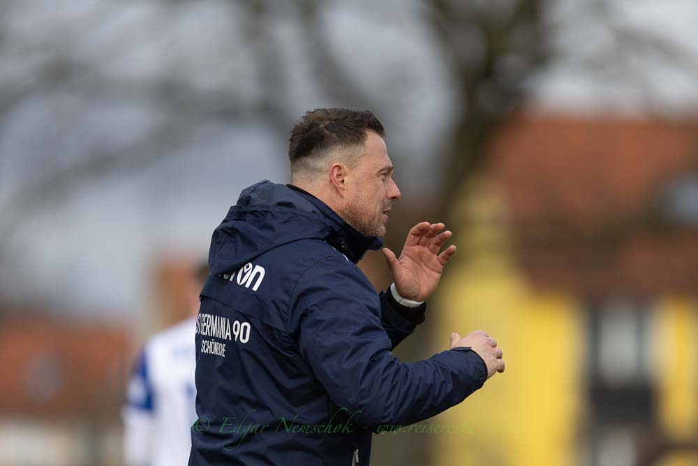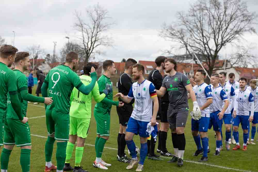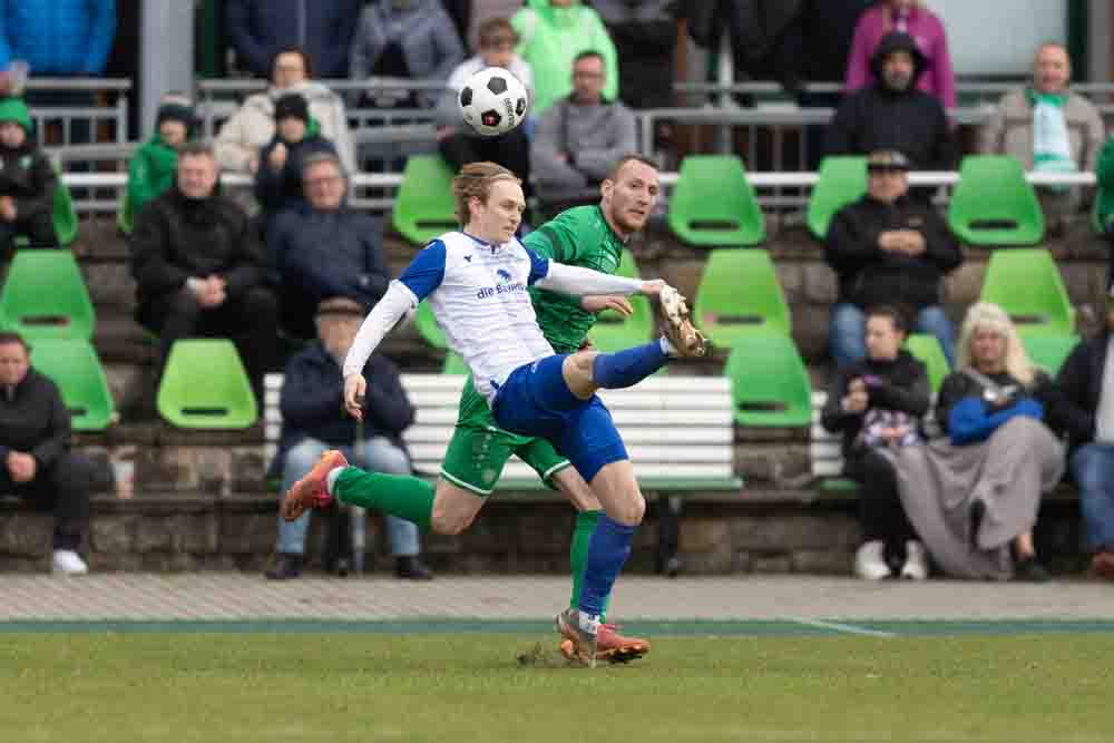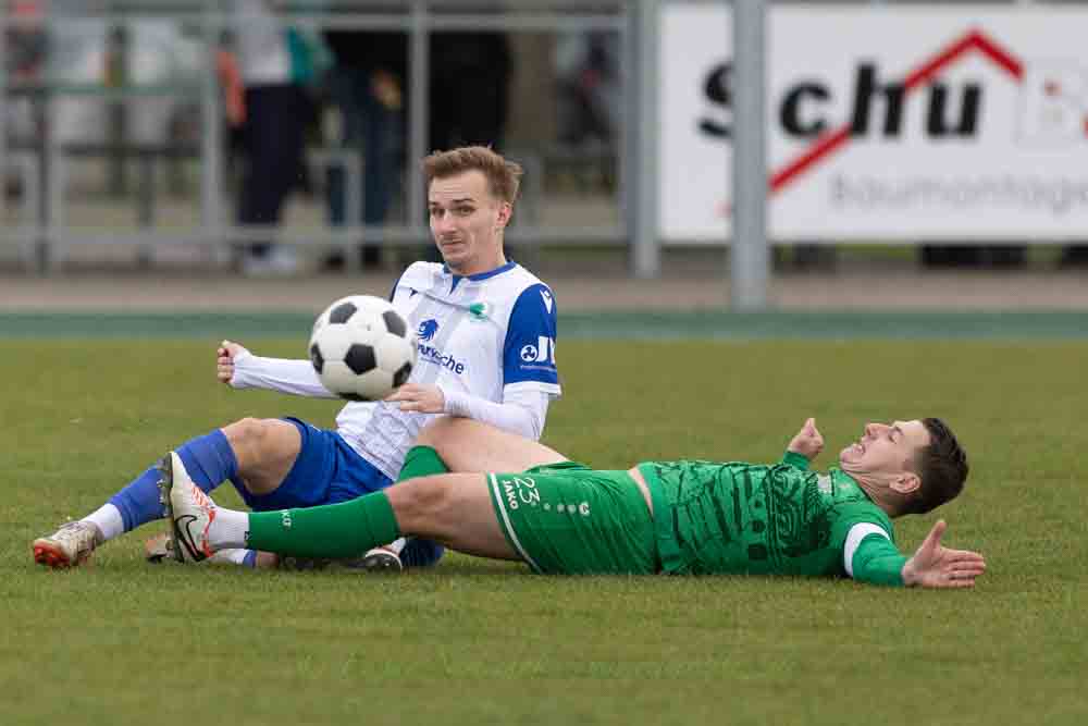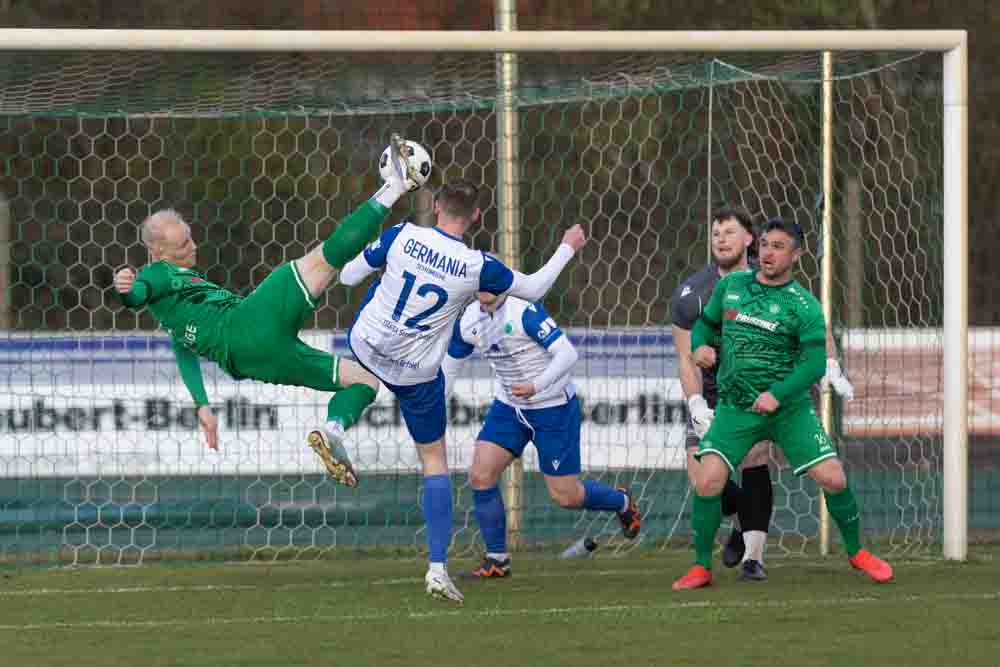 Nach dem Wiederanpfiff kamen zunächst die Gastgeber mit mehr Schwung aus der Kabine. Sie hätten nach Freistoß von Deniz Citlak sogar in Führung gehen können. Blenard Colacki vergab erneut knapp. Weiter blieb alles sehr eng auf dem Platz und so langsam kam die Frage auf, wer würde den ersten großen Fehler machen? Trainer Matthias Schönknecht wechselte gleich drei Spieler aus und auch Oliver Richter brachte zwei frische Kräfte. Aber das Geschehen änderte sich kaum. Beide Teams belauerten sich und ließen jeweils kaum Spielzüge zu. Nach einer Ecke von Deniz Citlak hatte Grün-Weiß Abwehrspieler Leon Barlage die ganz große Gelegenheit zum Führungstreffer. Artistisch schoss er im Abschluss aufs Germania Tor.