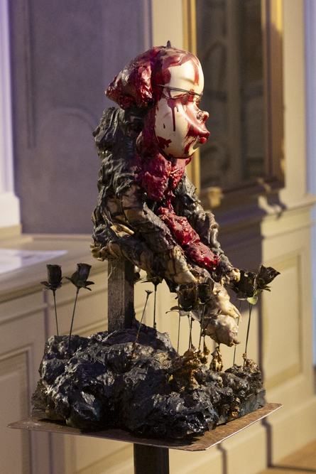 18 Künstlerinnen und Künstler zeigten, was sie zu diesem schwierigen Thema zu bieten hatten. Und forderten damit in höchstem Maße die Fantasie der Besucher heraus. Wer rechnet schon mit damit, dass es Kunst ist, wenn ein geknicktes MacBook als Kantenschoner an einer Glastür fungiert, wie es Alexander Endrullat präsentierte oder dass der von Thomas Judisch weggeworfene Rosenstrauß die „Die Akzeptanz der Einsamkeit“ darstellen soll. Herausfordernder ist der Harzguss von Szymon Kobylarz, der den Kopf von Heinrich dem Frommen von Schlesien, Krakau und Großpolen (1238-1241) auf der Grundlage anatomischer Beschreibungen des arischen Gesichtstyps nachmodellierte, so, wie ihn die Nationalsozialisten gern gesehen hätten. So berührt der Künstler – passend zum Thema der Ausstellung – deutlich erkennbar das Kapitel deutsch-polnischer Spannungen, oder besser gesagt „Verspannungen“.