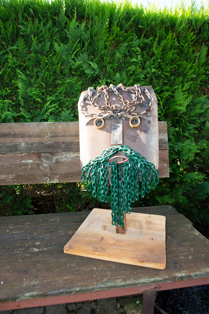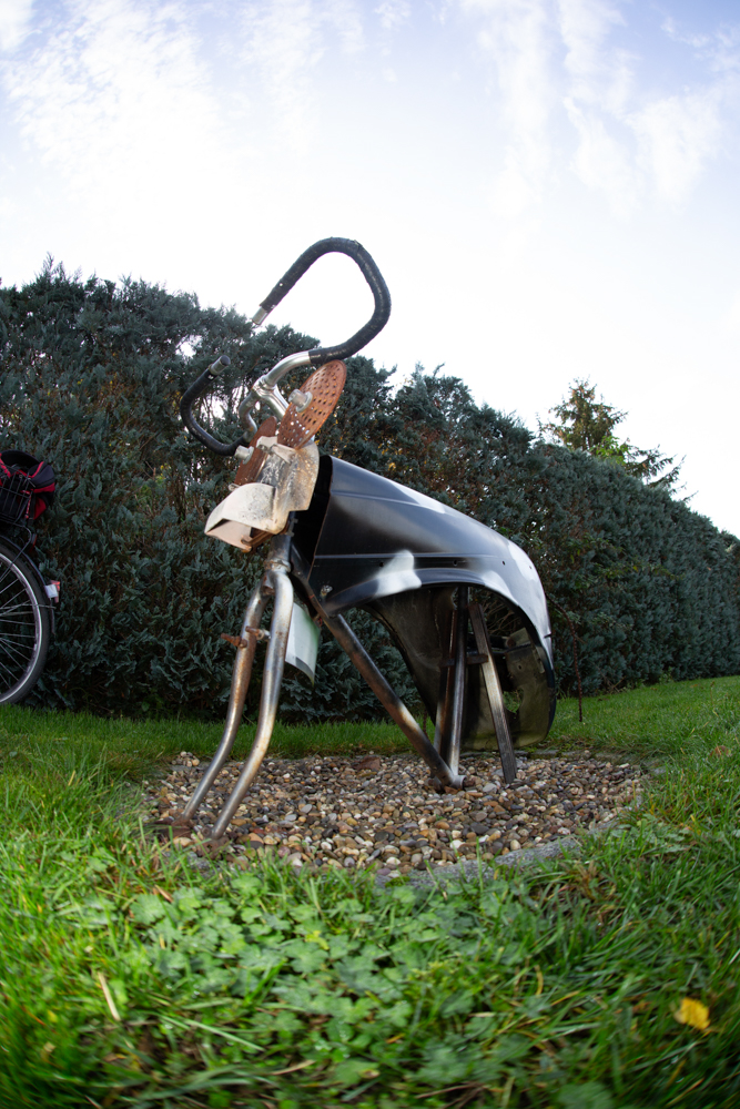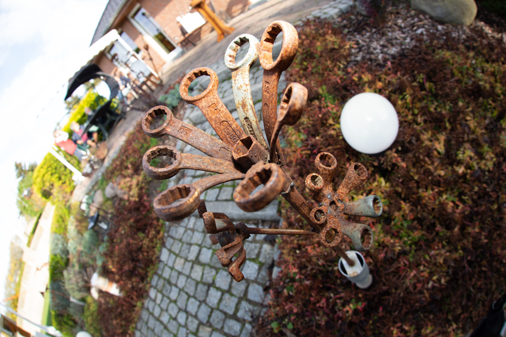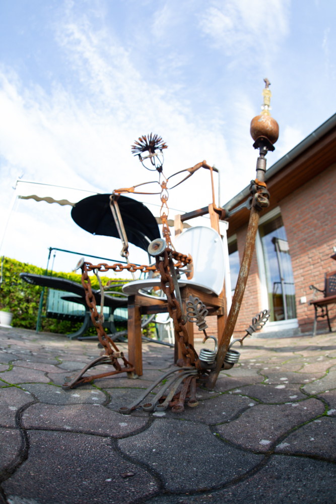 „Parship“ kann man auf herkömmliche Weise oder auch als ein „Paar Schippen“ sehen. Der Rüdersdorfer Künstler Jan Ristau – Jari – jedenfalls tut das. Mit einer großen Portion Humor, Lebendigkeit, Lebenslust, Übermut und künstlerischem Können schafft er aus Alltagsgegenständen Neues, Originelles. Da kommt die ausgediente Grillpfanne als Schildkröte des Wegs, wobei blanke Kochlöffel die Beine darstellen. Und der Bösewicht aus dem „Krieg der Sterne“ Darth Vader „muss bei mir jetzt den Rasen mähen“, sagt Jan Rist. Obwohl viele Betrachter die Figur aus Harken, Schippen, Werkzeugen und anderen Metallgegenständen aus Haus und Hof sehr wohl auch als Gevatter Tod interpretieren. „Das genau ist mein Ziel. Soll doch jeder Betrachter sehen, was er möchte. Ich betitele meine Arbeiten absichtlich nicht.“ Seine Schlüsselblume aus rostigen Schraubenschlüsseln passt dennoch genau dazu.