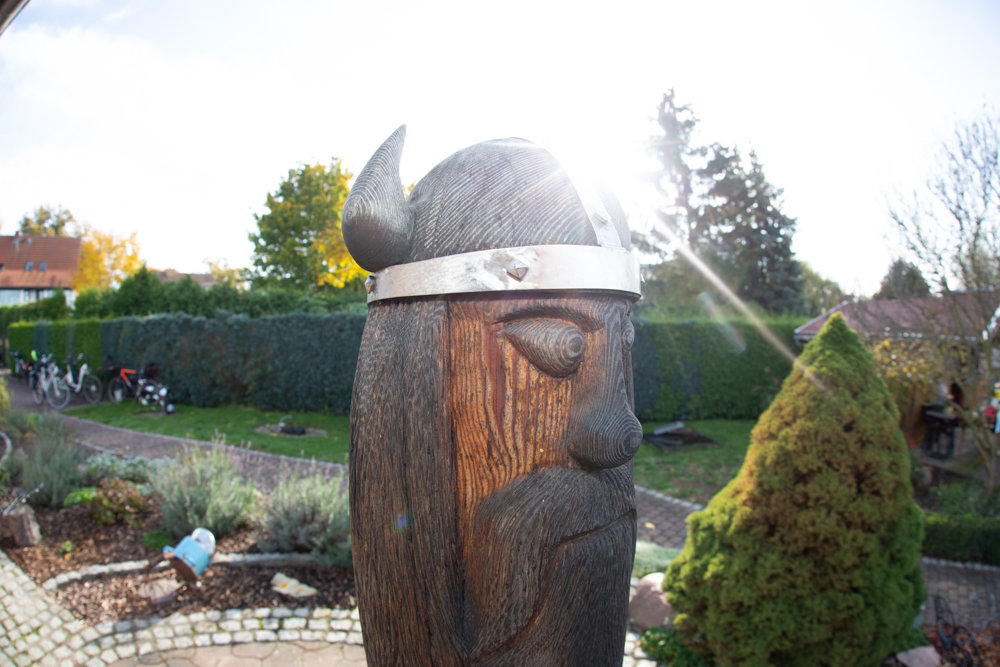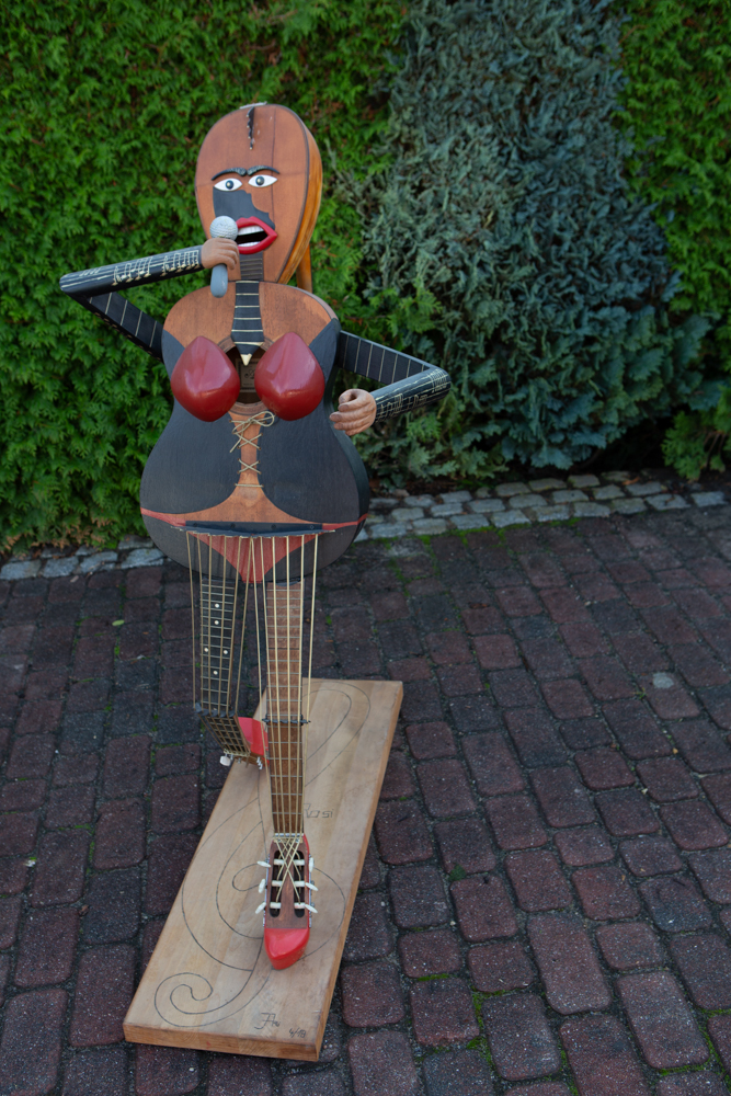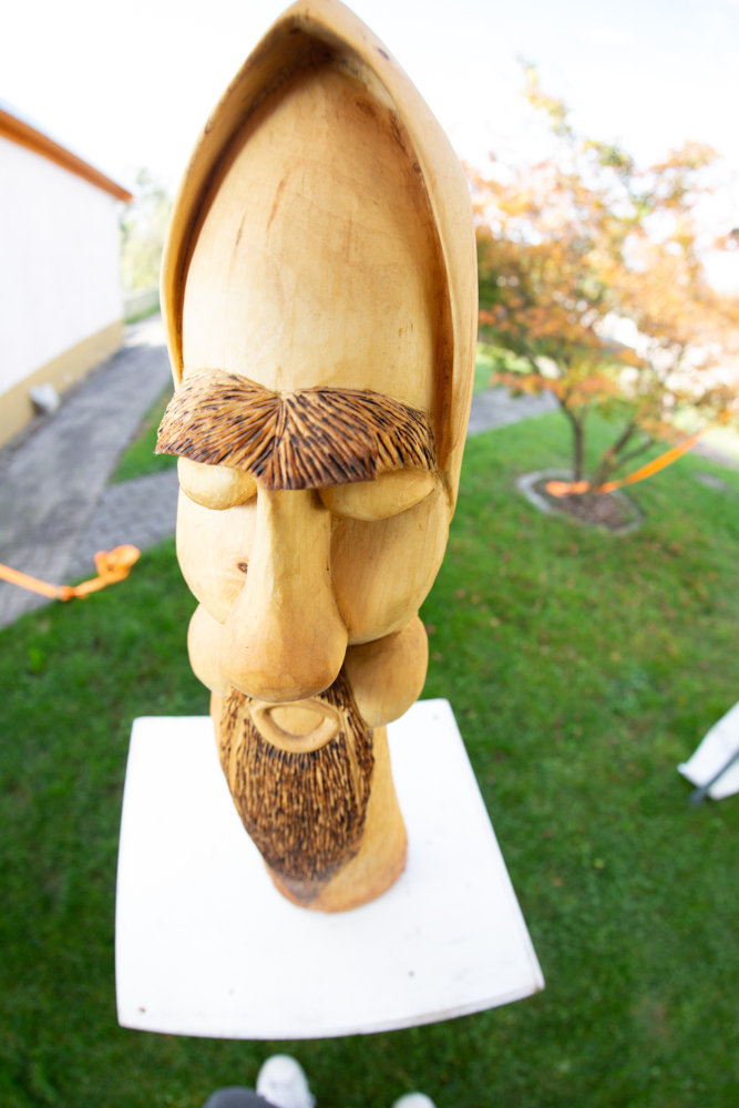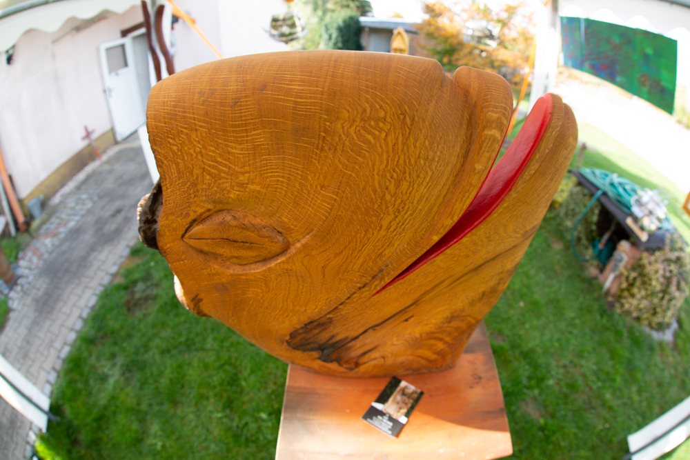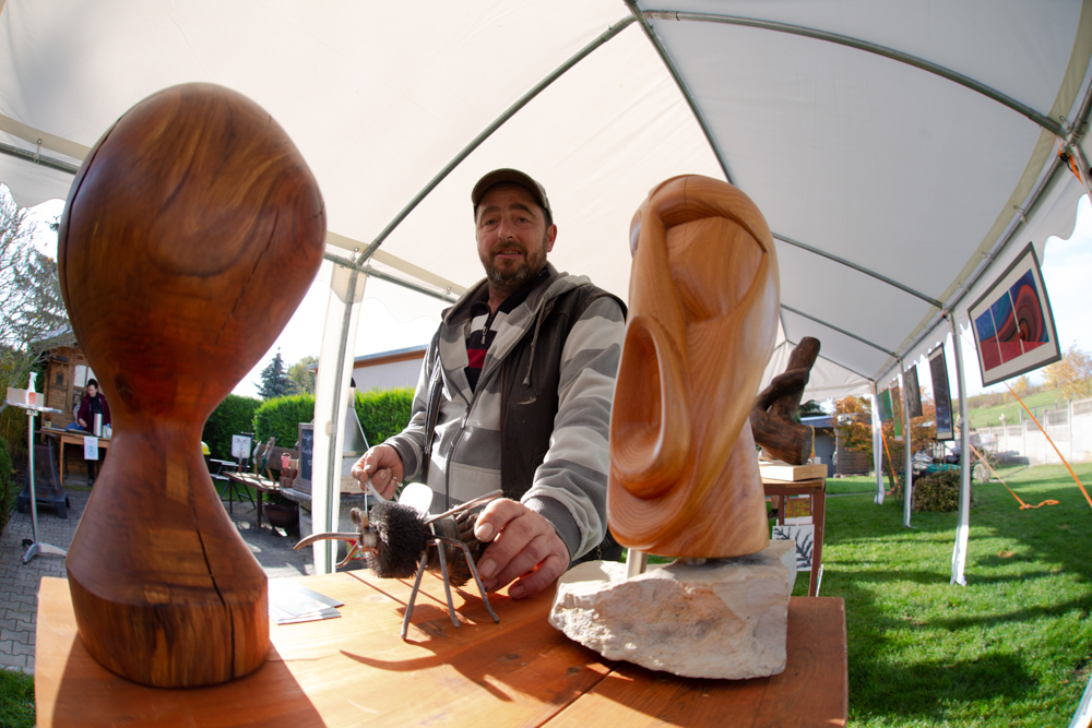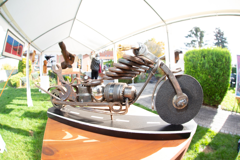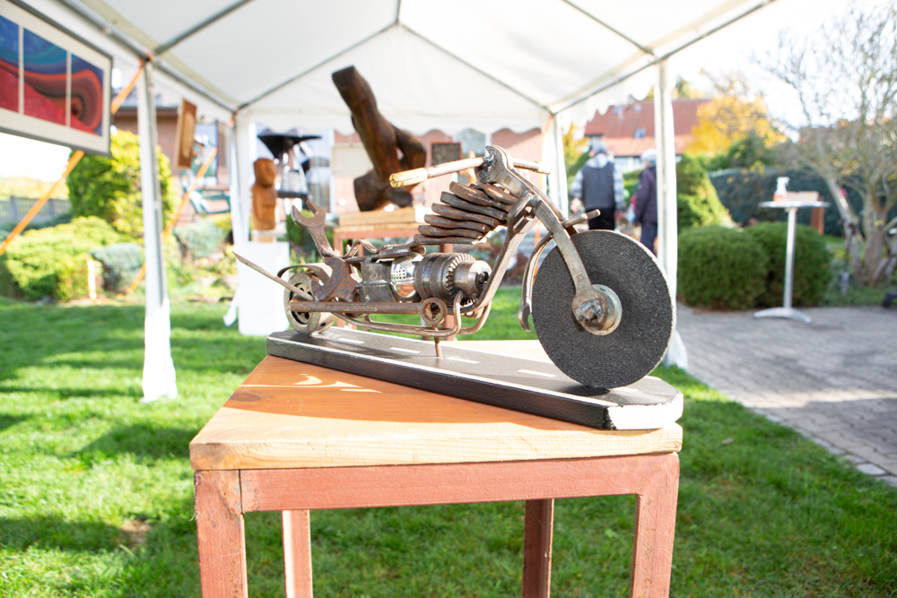 Jan Ristau hat ganz offensichtlich Spaß an seiner kreativen Ader, die er auf seinem Grundstück in der Hans-Schroer-Straße ausleben kann. „Manchmal ist er tagelang in seiner Werkstatt verschwunden“, sagt seine Frau und freut sich vor allem darüber, dass Ristau ein solch kreatives Hobby hat. Das hat sich herumgesprochen und so bringen die Nachbarn so manches Mal ausrangiertes Zeug von Keller- oder Dachbodenentrümpelungen vorbei. „Wenn dass so 150 Kilo Schrott vor der Tür liegen, ist mir aber nicht mehr so nach lachen zumute“, sagt sie. Dem 50-jährigen gelernten Maschinenbauer fällt immer wieder was neues ein, was er aus dem Alten machen kann. „Aber immer Metall wird auch mal langweilig“, sagt Ristau. Dann nimmt er ein Stück Holz und holt den Zwergenkönig Laurin daraus hervor oder er greift zum Pinsel und probiert aus, wie weit sich schwarze und weiße Farbe zu einem . Seit 20 Jahren beschäftigt er sich auf so unterschiedliche Weise künstlerisch, und sagt immer noch: „Ich weiß doch, dass ich es nicht kann“. „Angefangen habe ich mit filigranem Holzschmuck“, sagt Ristau. Mittlerweile sind seine Arbeiten größer und gewichtiger geworden und schon auf Ausstellungen zu sehen gewesen. So bereits in Frankreich, wohin Ortsvorsteher Detlef Adler sie über die Partnerschaft der Gemeinde Rüdersdorf 2018 zum ersten Mal vermittelt hat.