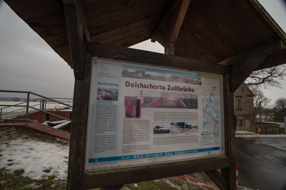Der Ort Zollbrücke entstand nach der Oderregulierung. Im Jahr 1755 errichteten erste Siedler eine Holzbrücke über die Oder und verlangten für das Überqueren der Brücke Zoll. Der entstehende Ort wurde nach der Brücke benannt. Die Bauern aus Zäckeritz nutzten das Bauwerk, um ihre Ländereien im Oderbruch betreten zu können. 1806 zerstörte ein Eishochwasser die Brücke. Sie wurde baufällig und durch eine Fähre ersetzt. Der Betrieb der Fähre wurde im Jahre 1945 nach dem Zweiten Weltkrieg eingestellt. Die Deichscharte verblieb als Öffnung und wurde zum Wahrzeichen des Hochwasserschutzes im Oderbruch.[2]
