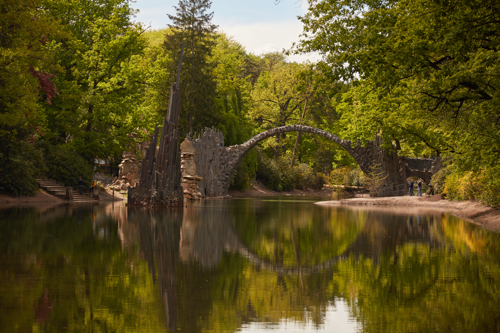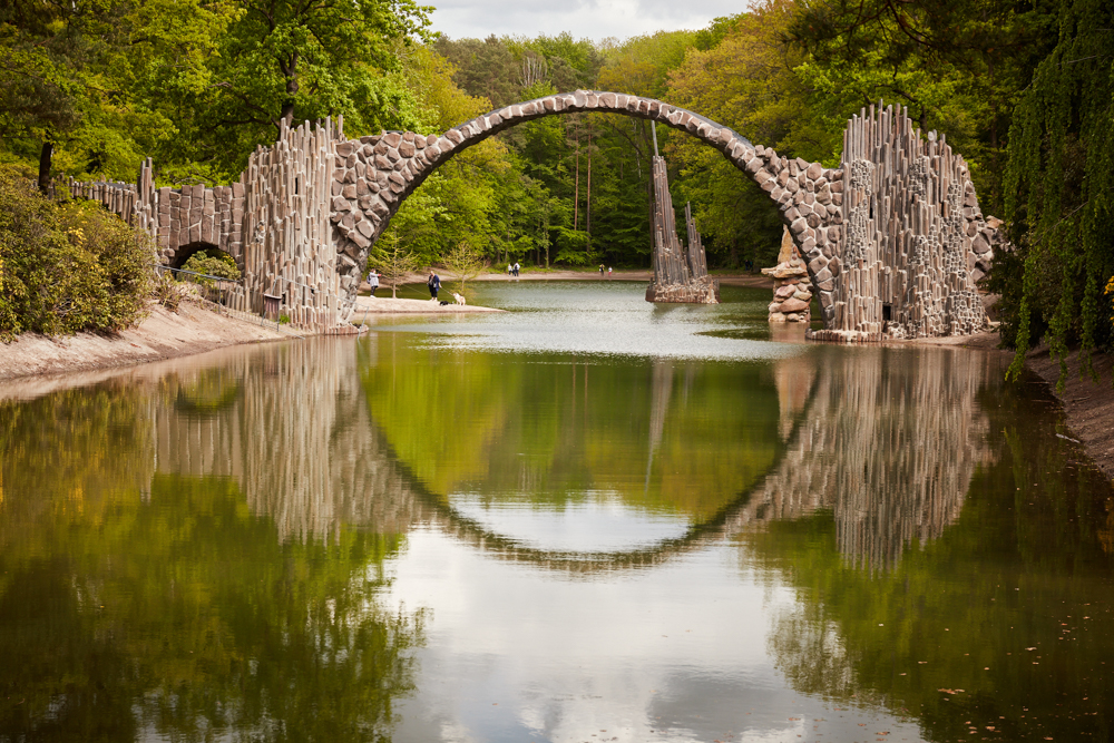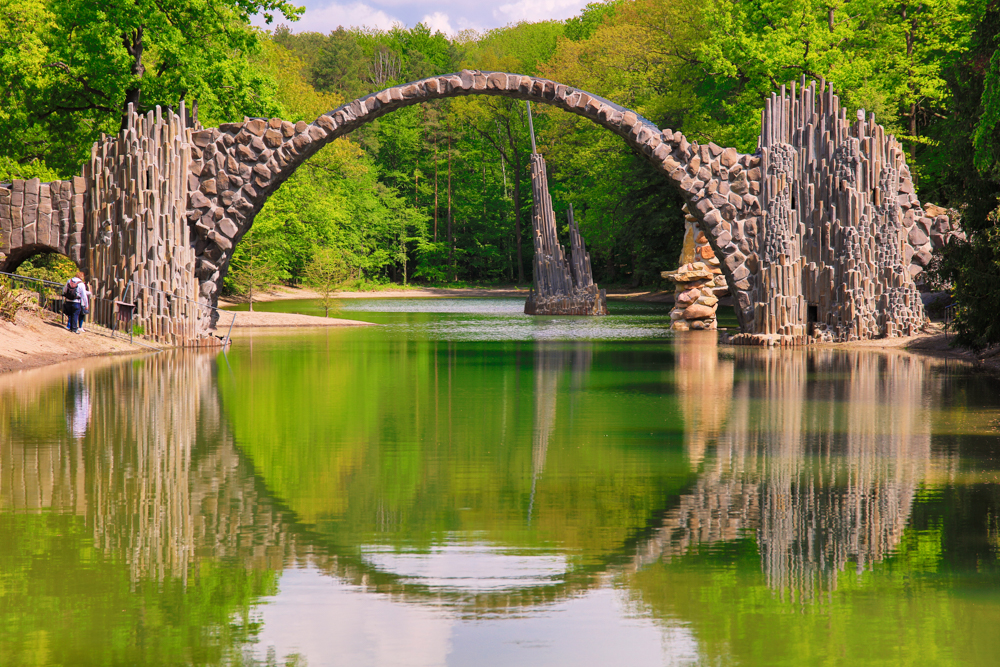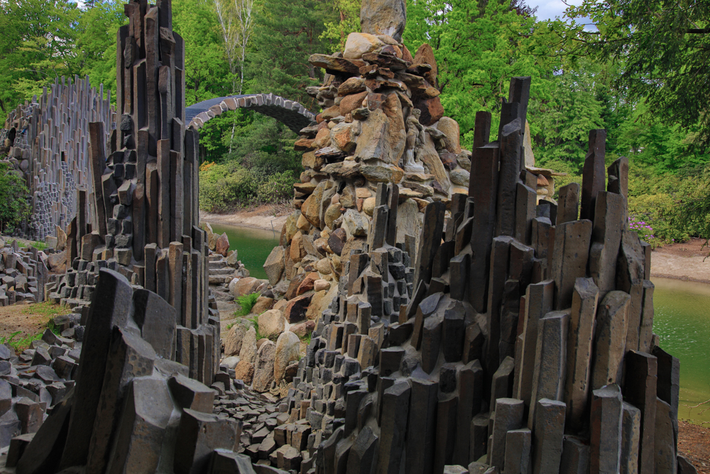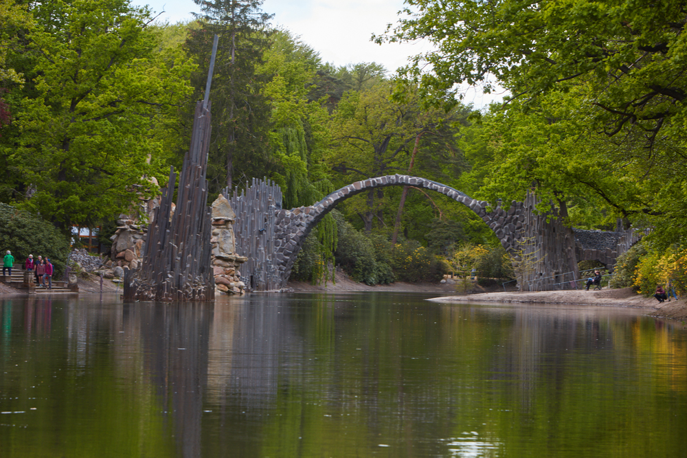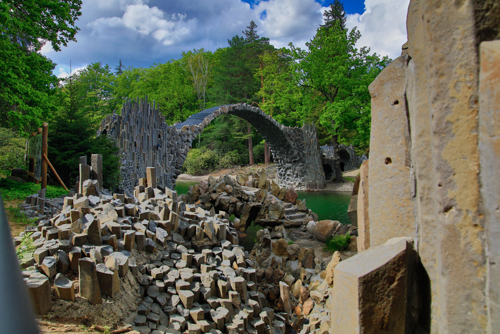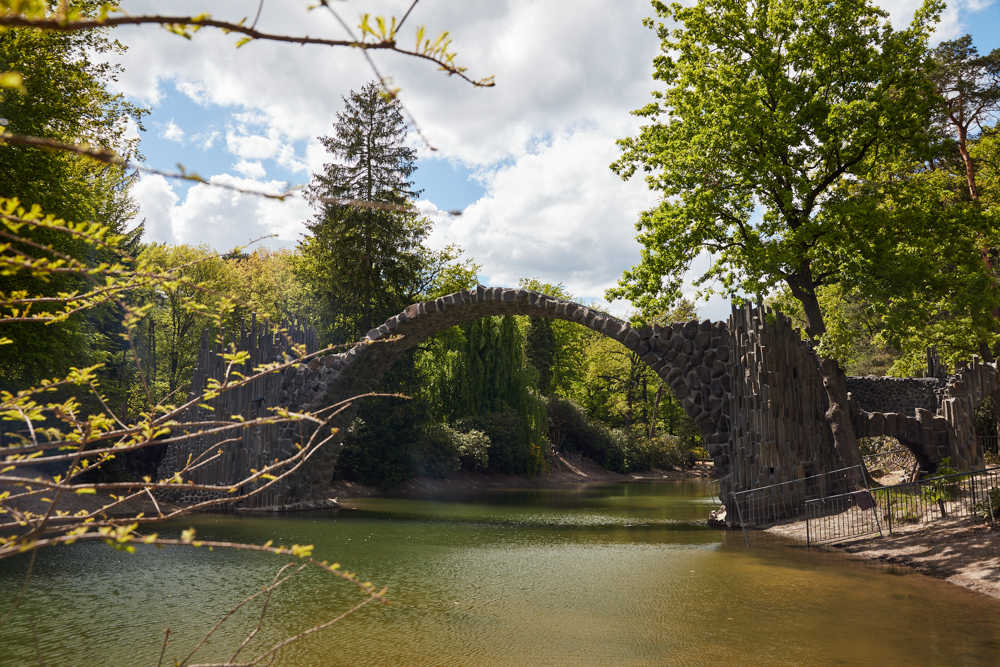 Friedrich Hermann Rötschke ließ ab 1860 in fast zehnjähriger Bauzeit über den 35 Meter langen Rakotzsee einne halbkreisförmigen Brückenbogen aus Basalt- und Feldsteinen errichten.
