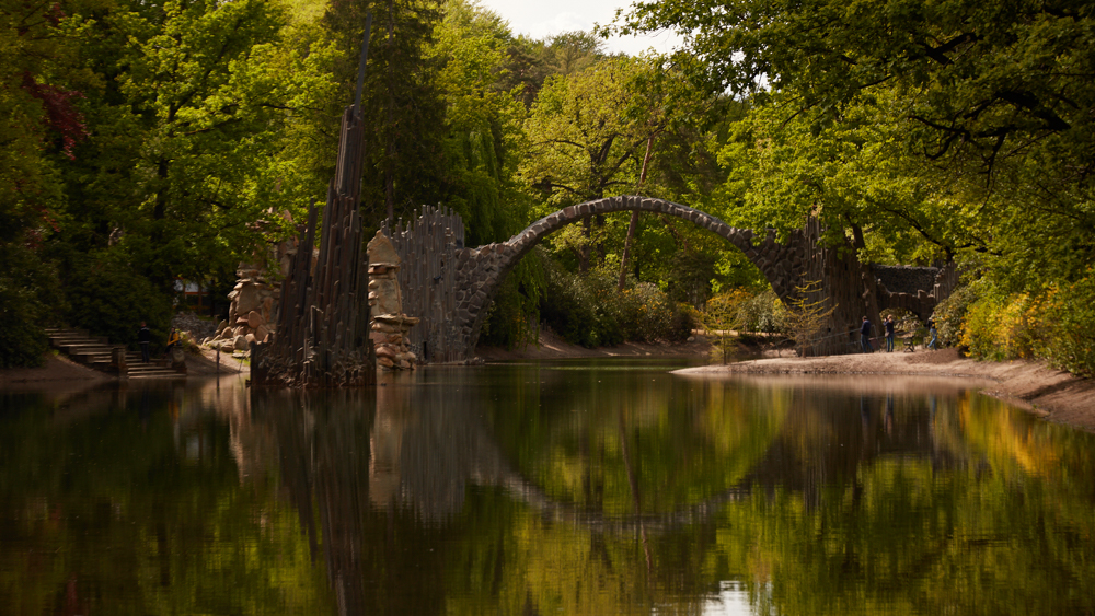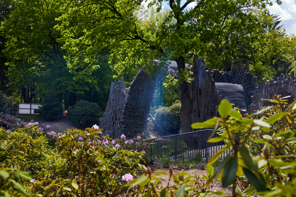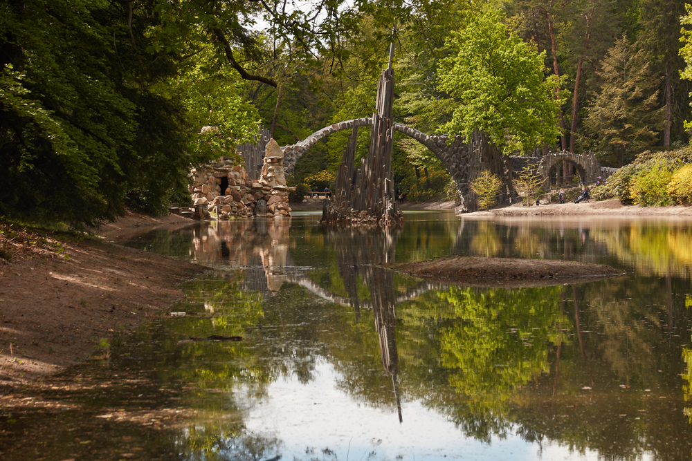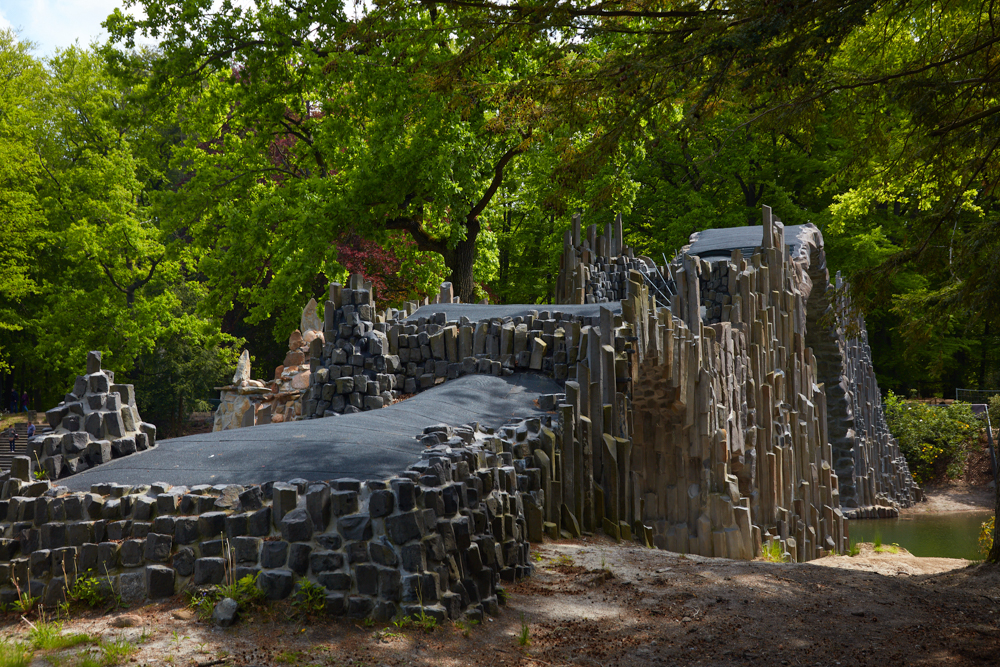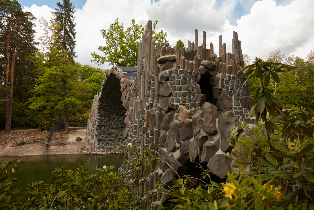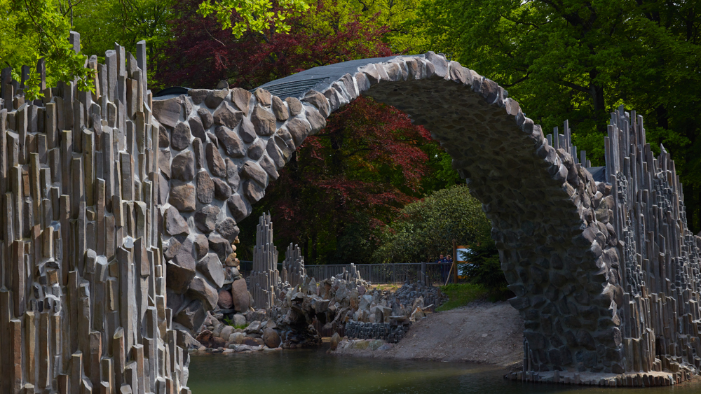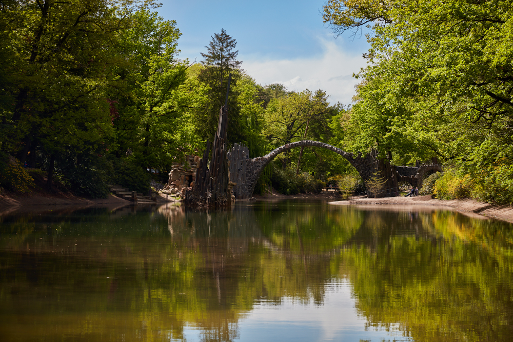 Friedrich Hermann Rötschke ließ ab 1860 in fast zehnjähriger Bauzeit über den 35 Meter langen Rakotzsee einne halbkreisförmigen Brückenbogen aus Basalt- und Feldsteinen errichten.