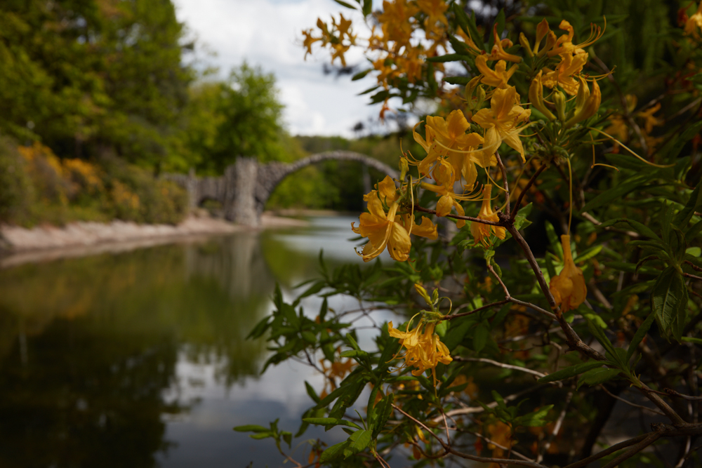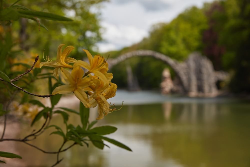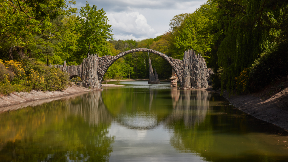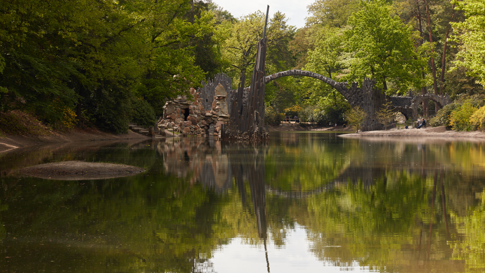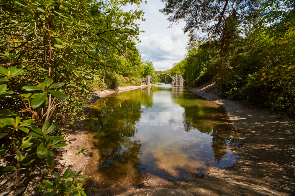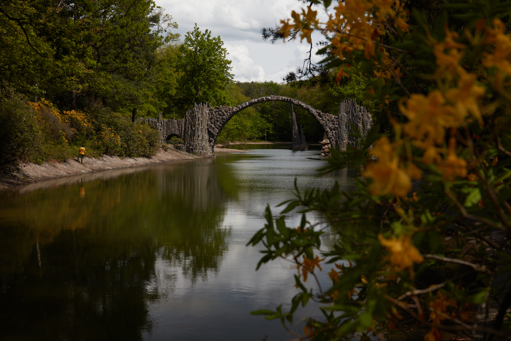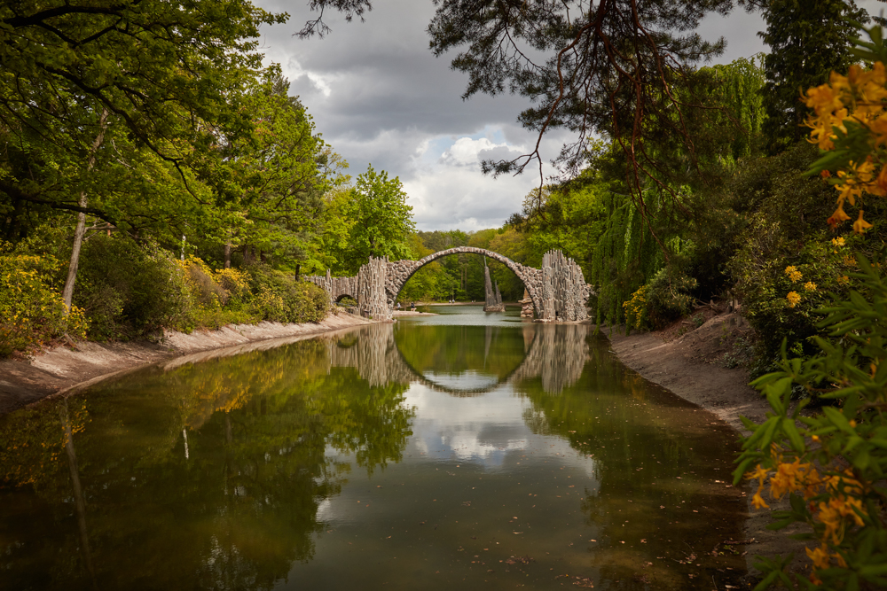 Friedrich Hermann Rötschke ließ ab 1860 in fast zehnjähriger Bauzeit über den 35 Meter langen Rakotzsee einne halbkreisförmigen Brückenbogen aus Basalt- und Feldsteinen errichten.