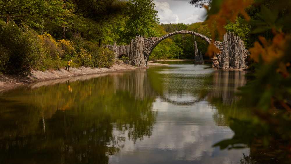 Der Brückenbogen spiegelt sich im Wasser zu einem vollständigen Kreis wider.